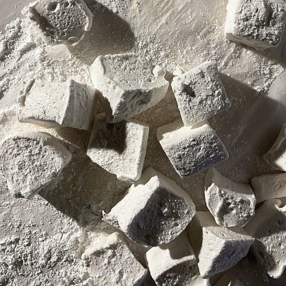 after 6 hours, remove marshmallows from the pan by pulling up the parchment lining. use a knife coated in coconut oil (or nonstick spray) to cut the marshmallow into cubes or any shape of your choosing.